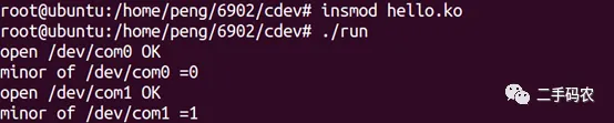#include <stdio.h>#include <sys/types.h>#include <sys/stat.h>#include <fcntl.h>main(){ int fd0,fd1; int minor; fd0 = open("/dev/com0",O_RDWR); if(fd0<0) { perror("open fail \n"); return; } printf("open /dev/com0 OK\n"); read(fd0,&minor,sizeof(minor)); printf("minor of /dev/com0 =%d\n",minor); close(fd0); fd1 = open("/dev/com1",O_RDWR); if(fd1<0) { perror("open fail \n"); return; } printf("open /dev/com1 OK\n"); read(fd1,&minor,sizeof(minor)); printf("minor of /dev/com1 =%d\n",minor); close(fd1);