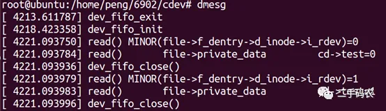 从内核log来看,MINOR(file->f_dentry->d_inode->i_rdev)可以成功读取此设备号。而read接口函数也成功通过file->private_data得到了设备结构体变量(初始化的时候为不同设备的test成员附了不同的值)。