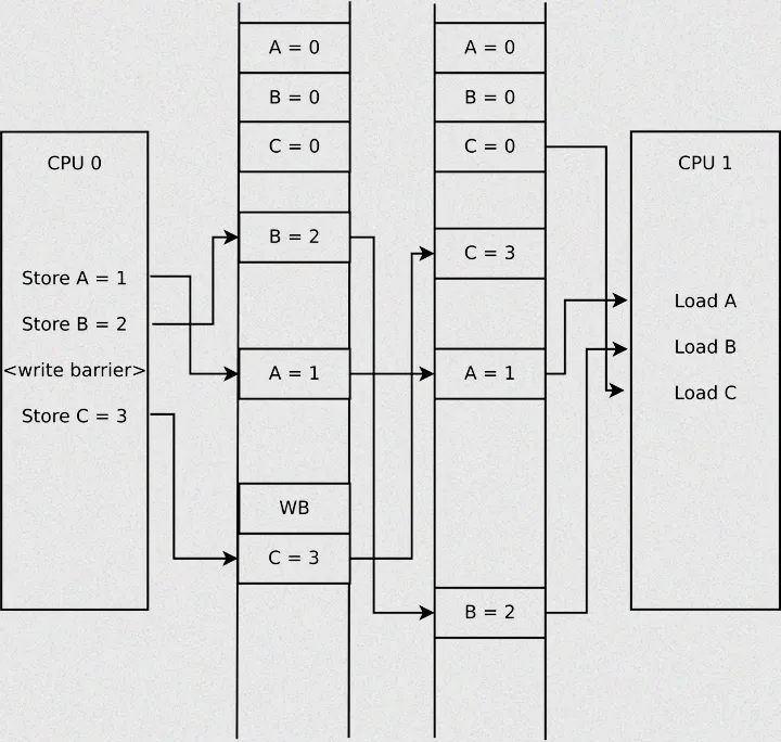 解决办法:在核心A的两个写操作后加写屏障wmb(),强制写缓冲同步,确保a和b的写操作同时生效;核心B的两个读操作前加读屏障rmb(),确保读取顺序。