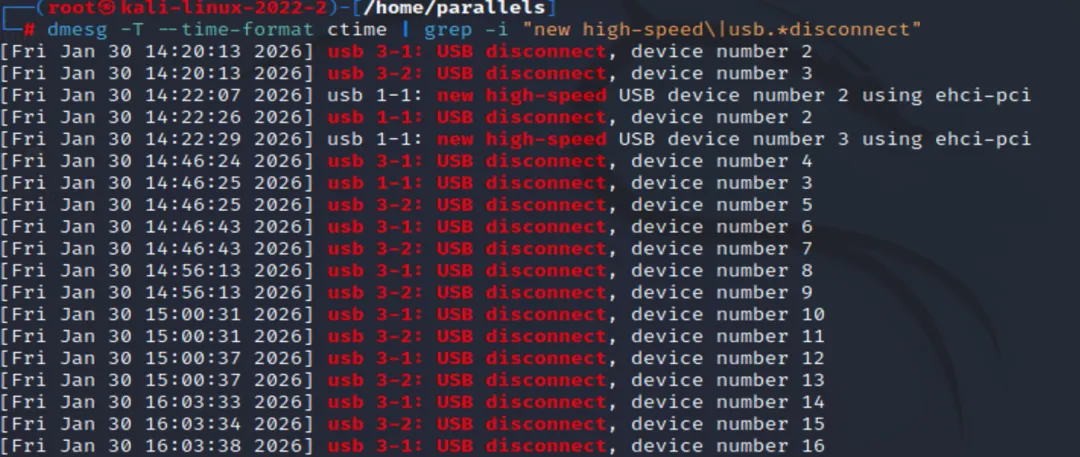 方法一:使用 dmesg命令(截图以Kali linux为例)dmesg 直接读取内核环缓冲区,是查看最近USB事件最直接的方法。dmesg | grep -i "new high-speed\|usb.*disconnect"