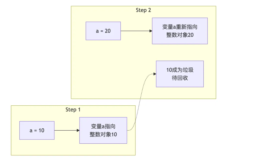 a = 10# 创建一个整数对象10# 将变量名a绑定到该对象a = 20# 创建新的整数对象20# 将变量名a重新绑定到新对象# 原对象10如果没有其他引用,将被垃圾回收