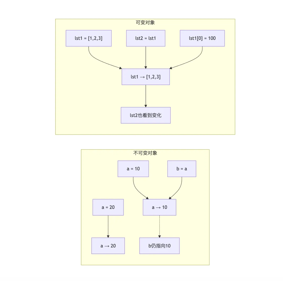 # 不可变对象a = 10b = aa = 20print(b) # 10(b不受影响)# 可变对象lst1 = [1, 2, 3]lst2 = lst1lst1[0] = 100print(lst2) # [100, 2, 3](lst2也改变)