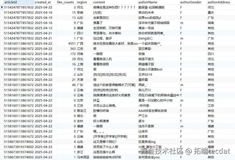 - 评论数据:文章ID、发布时间、点赞数、地区、评论内容、作者信息等;