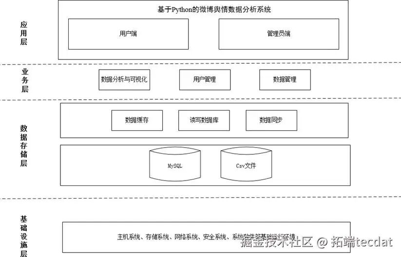基于上述数据采集、预处理与分析逻辑,我们搭建完整的微博舆情数据分析系统,采用B/S架构,分为用户管理、数据管理、数据分析与可视化三个核心模块,适配政府、企业等不同场景的舆情监测需求。