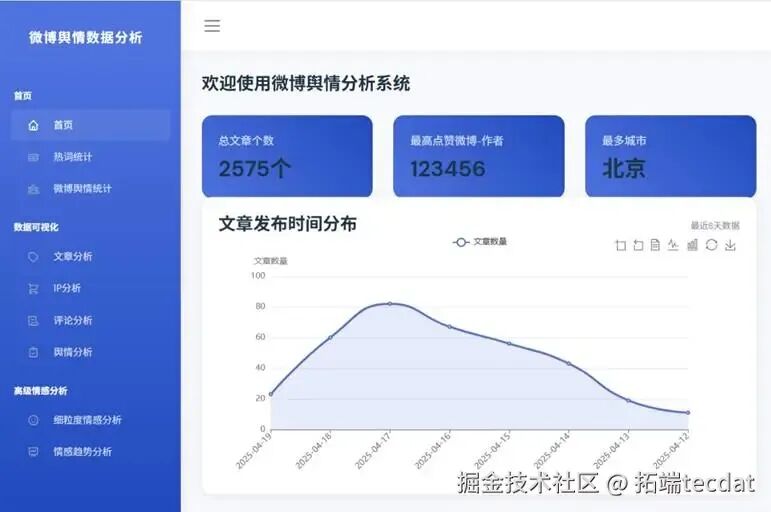 但海量数据的冗余性、异构性,让传统人工处理方式难以应对,高效的舆情采集、处理与分析系统,成为当下舆情管理的迫切需求。作为长期深耕数据分析领域的从业者,我们曾承接过微博舆情监测相关客户咨询项目,帮助客户搭建高效的舆情分析体系,解决数据采集低效、情感分析不精准、可视化效果不佳等痛点。本文内容改编自过往客户咨询项目的技术沉淀并且已通过实际业务校验,该项目完整代码与数据已分享至交流社群。阅读原文进群,可与800+行业人士交流成长;还提供人工答疑,拆解核心原理、代码逻辑与业务适配思路,帮大家既懂 怎么做,也懂 为什么这么做;遇代码运行问题,更能享24小时调试支持。本文将以学生易懂的方式,从数据采集、预处理、分析到系统设计实现,完整拆解基于Python的微博舆情数据分析系统,结合网络爬虫、SnowNLP情感分析、基于词典的细粒度情感挖掘、ECharts可视化等技术,讲清舆情分析技术的前世今生,同时给出可落地的系统实现方案,帮助读者快速掌握舆情数据分析的核心逻辑与实操方法,兼顾理论性与实战性。我们还特别提供应急修复服务:24 小时响应 “代码运行异常” 求助,比自行调试效率提升 40%,助力读者顺利落地实操。