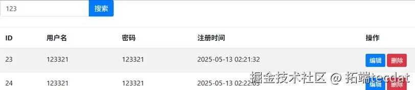 # 中文注释:该代码位于views/user.py文件,省略蓝图初始化代码from flask import request, redirect, render_template, session, jsonifyfrom datetime import datetime# 中文注释:导入数据库操作函数,省略数据库连接代码from db import querys# 中文注释:用户注册路由@app.route('/register',methods=['GET','POST'])def user_register(): if request.method == 'POST': # 中文注释:获取表单数据,转换为字典格式 form_data = dict(request.form) # 中文注释:获取当前时间,作为注册时间 register_time = datetime.now().strftime('%Y-%m-%d %H:%M:%S') # 中文注释:验证两次密码是否一致 if form_data['password'] != form_data['passwordCheked']: return'两次密码输入不一致,请重新输入' # 中文注释:查询数据库,判断用户名是否已注册,省略部分查询优化代码 def check_username(item): return form_data['username'] in item user_list = querys('select * from user', [], 'select') exist_user = list(filter(check_username, user_list)) if exist_user: return'该用户名已被注册,请更换用户名' # 中文注释:将新用户信息插入数据库,省略数据验证代码 querys('insert into user(username,password,createTime,role) values(%s,%s,%s,%s)', [form_data['username'], form_data['password'], register_time, 'user']) # 中文注释:注册成功,重定向到登录页面 return redirect('/user/login', 301) # 中文注释:GET请求,渲染注册页面 return render_template('register.html')