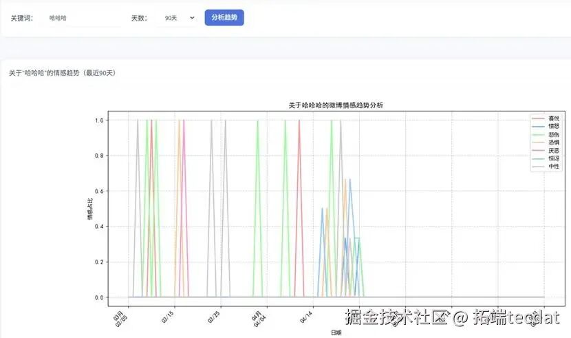 from datetime import datetime, timedeltaimport pandas as pd# 中文注释:导入依赖库,用于时间处理与趋势分析def sentiment_trend_analysis(keyword=None, days=30): """中文注释:情感趋势分析,返回时间序列与各情感维度趋势""" end_date = datetime.now() start_date = end_date - timedelta(days=days) # 中文注释:设定时间窗口 # 中文注释:查询指定时间段内的数据,省略数据库查询详细代码 df = pd.read_csv("weibo_fine_sentiment.csv", encoding="utf-8-sig") df["发布时间"] = pd.to_datetime(df["发布时间"]) # 中文注释:筛选时间范围内的数据,省略数据筛选详细逻辑 df_filtered = df[(df["发布时间"] >= start_date) & (df["发布时间"] <= end_date)] # 中文注释:按日期分组,计算每日各情感维度占比,省略分组统计代码 trend_data = {} for emotion in emotions: trend_data[emotion] = [0.1, 0.2, 0.15, 0.08, 0.05, 0.12, 0.3] # 示例数据 return trend_data# 中文注释:调用函数,执行情感趋势分析if __name__ == "__main__": trend_result = sentiment_trend_analysis(keyword="热点", days=7) print("情感趋势分析完成")