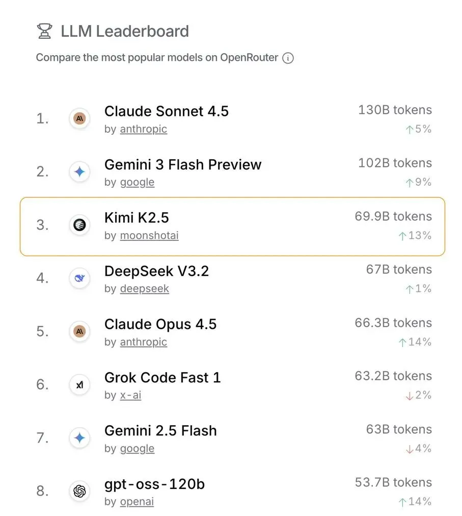 在全球最大的大模型API聚合平台OpenRouter上,Kimi K2.5模型发布次日就冲上了全球前三。