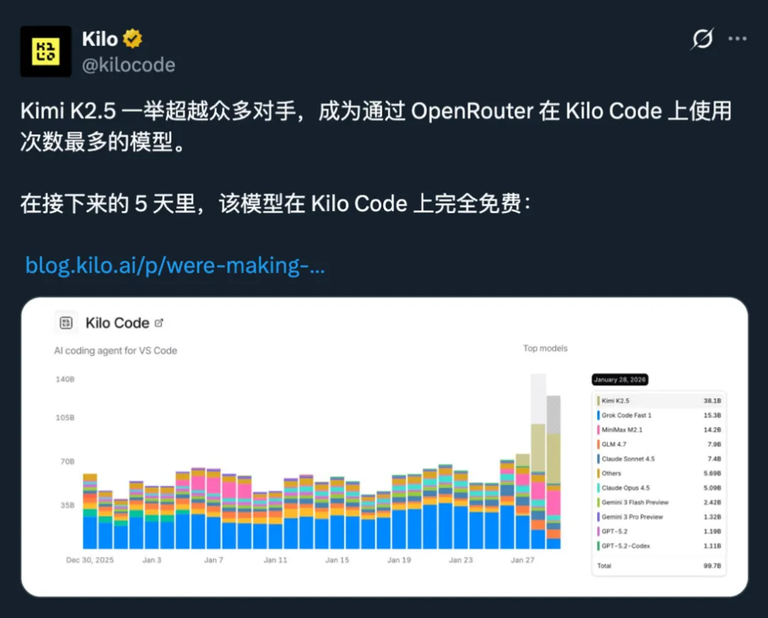 这份亮眼表现也迅速获得了头部编程工具平台的认可与青睐。Cursor的核心竞品,由GitLab创始人打造的知名编程工具Kilo Code宣布推出Kimi K2.5的首周免费活动后,K2.5也成为该平台上最受欢迎的模型,单日消耗超过380亿Token。