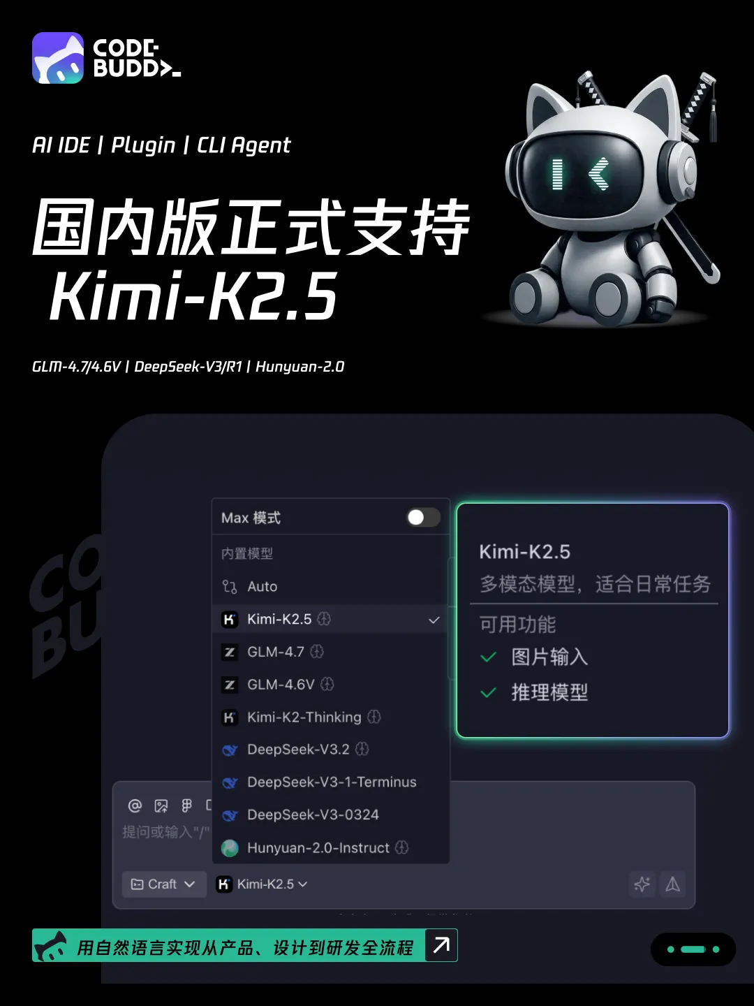 国内大厂旗下的编程工具同样第一时间接入了K2.5模型。腾讯CodeBuddy将其设定为首选模型;字节Trae宣布提供免费额度,阿里Qoder、美团CatPaw等据传也在接入中。