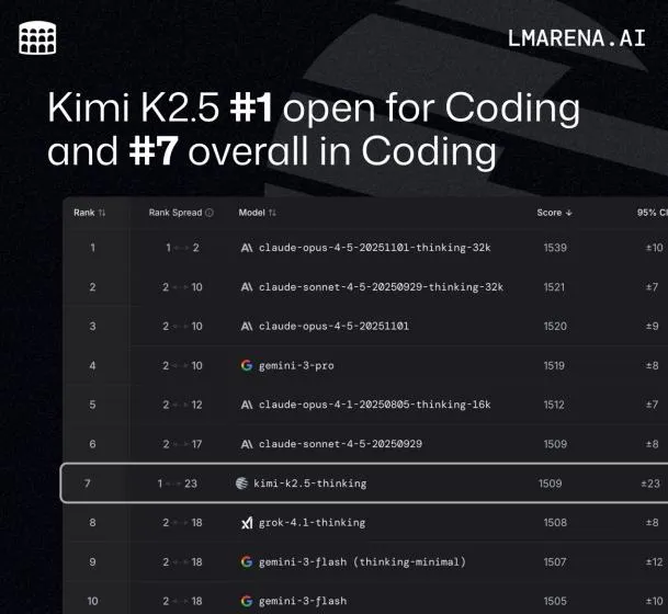 从知名匿名评测机构大模型竞技场LMarena公布的数据来看,K2.5在Thinking模式下,代码能力以1509分与Claude Sonnet 4.5持平。排在它前面的,只有Claude和Gemini最新的旗舰模型。这应该是开源模型代码能力的新高。