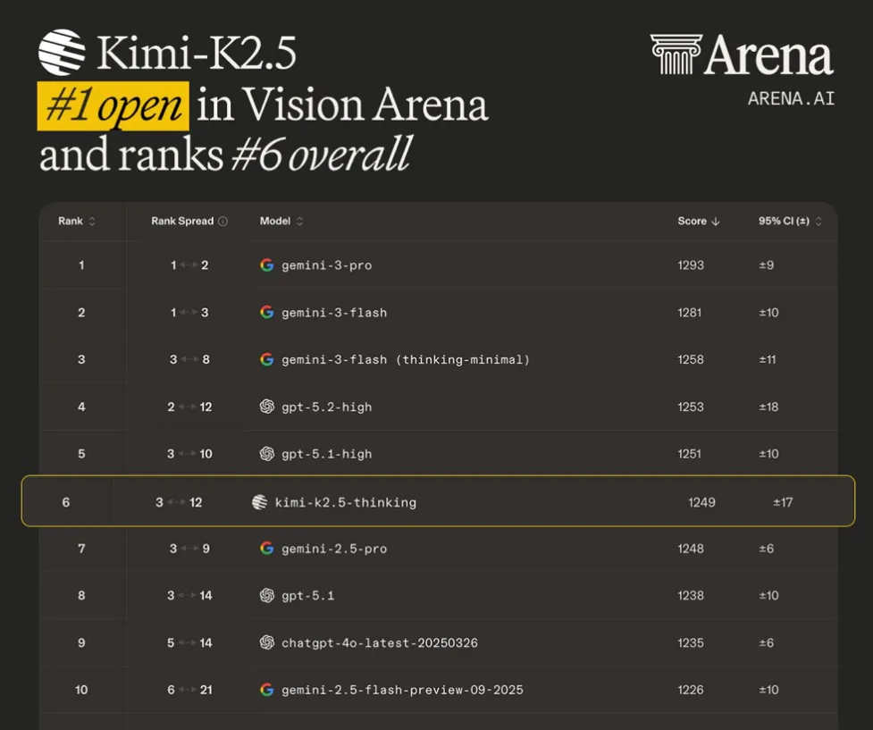 不止代码能力表现亮眼,K2.5在视觉能力上的评测成绩同样令人惊喜。从大模型竞技场的视觉能力匿名评测来看,K2.5模型的视觉能力比Claude更能打。
