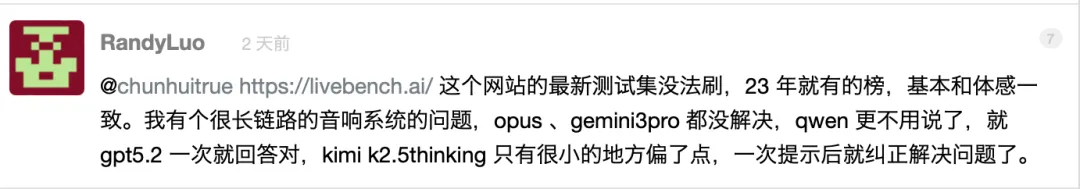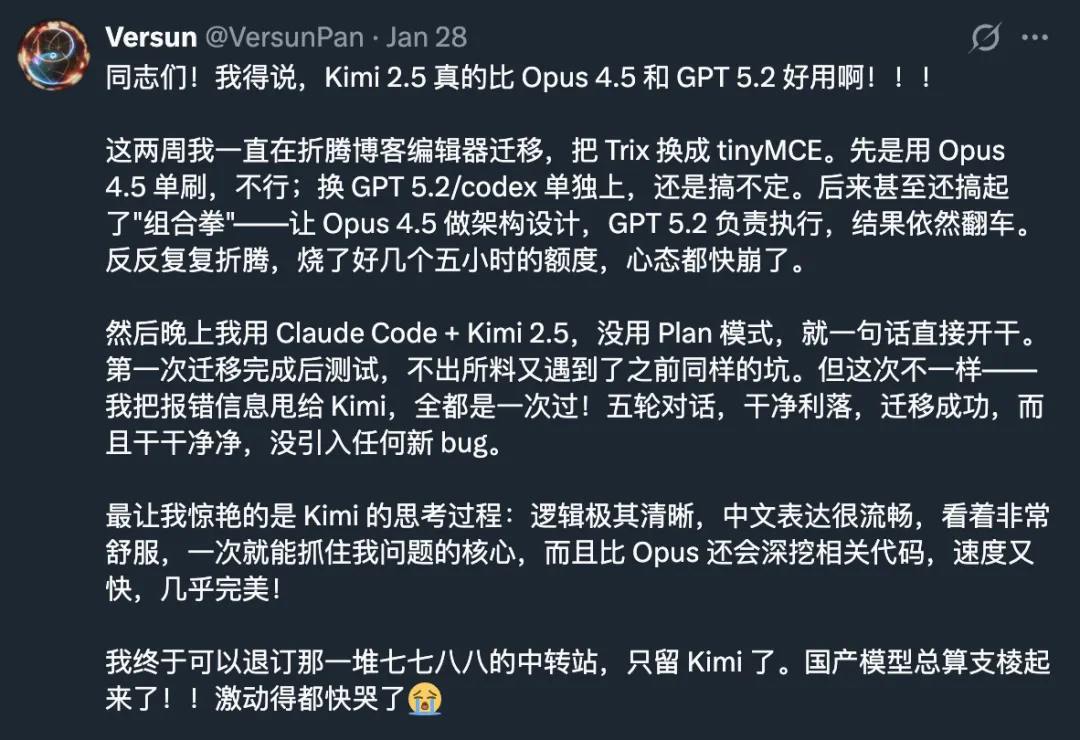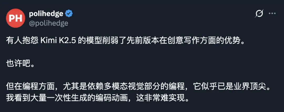 我们也从开发者社区看到一些真实反馈,K2.5的实际表现和体感,与榜单呈现的结果比较接近,代码能力确实有了提升。