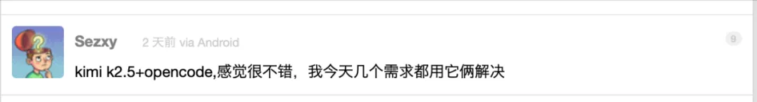 一位Sezxy的网友表示Kimi K2.5+OpenCode感觉很不错,几个需求都用它俩解决。