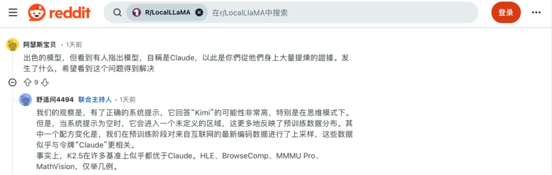 有网友抛出尖锐问题:Kimi K2.5非常棒,但我看到有人说模型会自称为Claude,并把这当作你们大量蒸馏(distill)自Claude模型的证据。这是怎么回事?