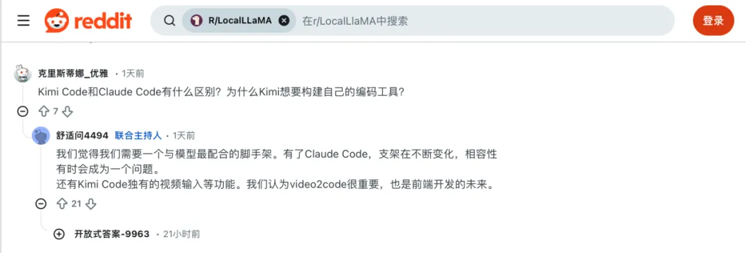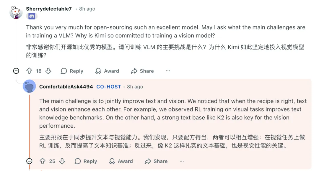 因此在1月29日凌晨,Kimi核心团队在Reddit平台举行了一场长达3小时的AMA(有问必答)活动,CEO杨植麟、算法团队负责人周昕宇、吴育昕三位联合创始人,与全球网友交流了K2.5的技术细节、产品规划与行业看法。这场对话中,许多关键问题的回应,让外界了解了更多K2.5的幕后。