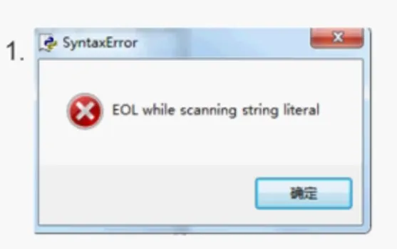 整句 “EOL while scanning string literal” 的完整含义是:在扫描字符串字面量时遇到了行尾,也就是你写的字符串没有写完就到了一行的结尾,通常是因为忘记写闭合的引号。