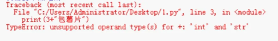 在执行 C:/Users/Administrator/Desktop/1.py 文件第3行时,发现你尝试对整数 3 和字符串 "包薯片" 执行 + 操作,但Python不支持整数与字符串直接相加。