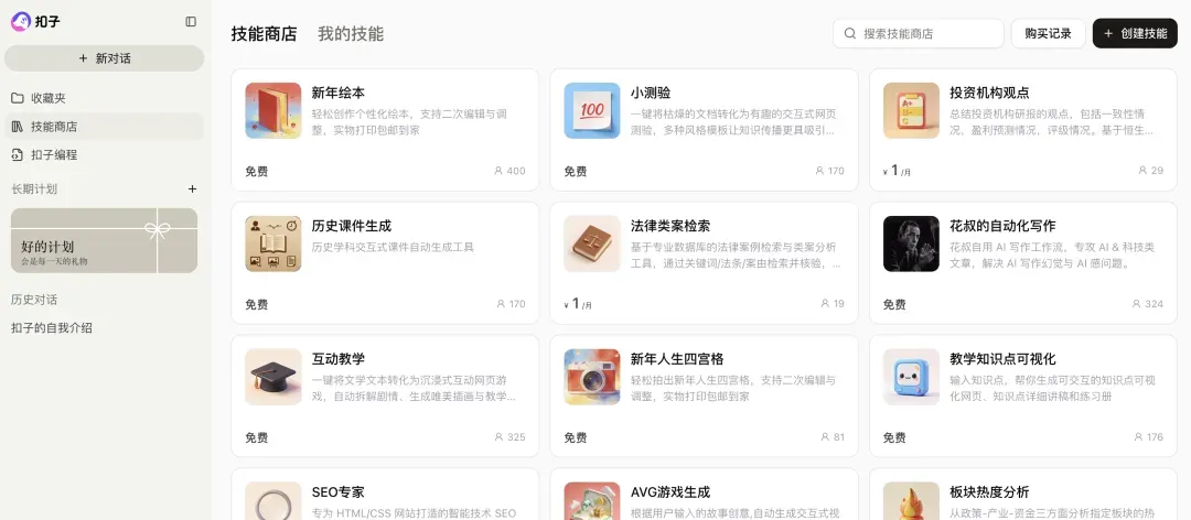 从用户群体来看,技能商店实现了“全民参与”的可能。对于普通人,它降低了AI变现的门槛,让“零技术基础”也能分享AI红利;对于专业开发者,它提供了高效的变现渠道,无需投入精力搭建流量渠道,专注于技能打磨即可;对于企业,它则提供了低成本的技能获取方式,无需投入大量资源开发专属AI工具,通过调用商店内的成熟技能,就能快速提升效率。这种多角色共赢的生态,让Coze技能商店不仅是一个交易平台,更成为了AI技能的生产与流通中枢。