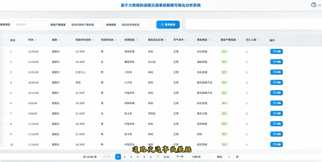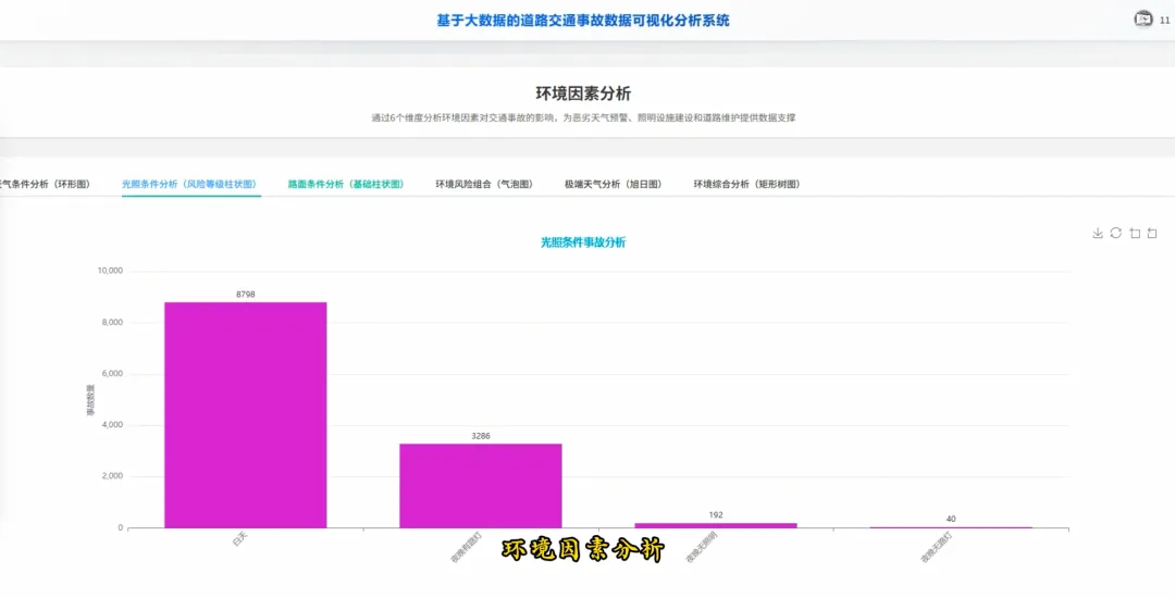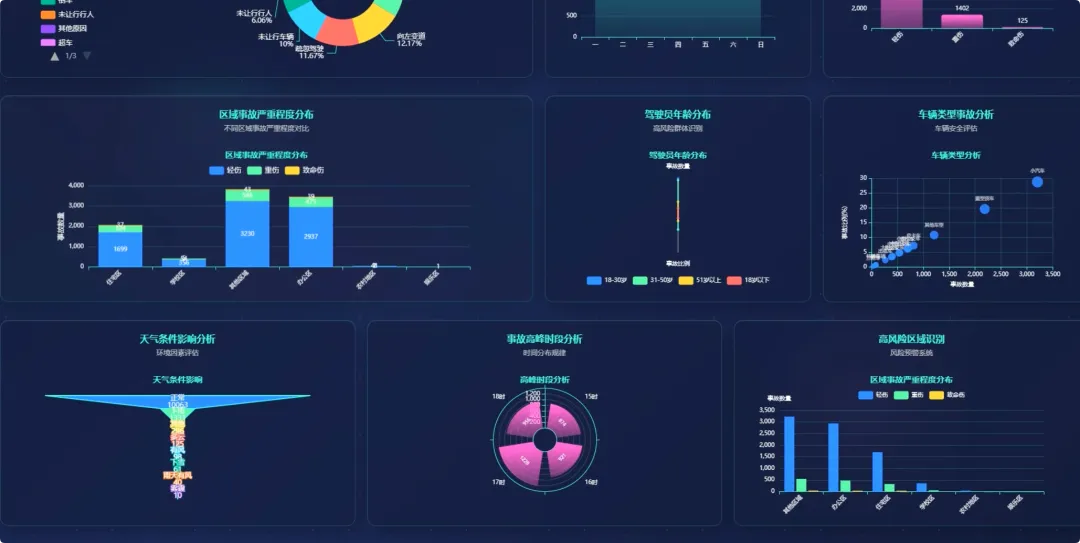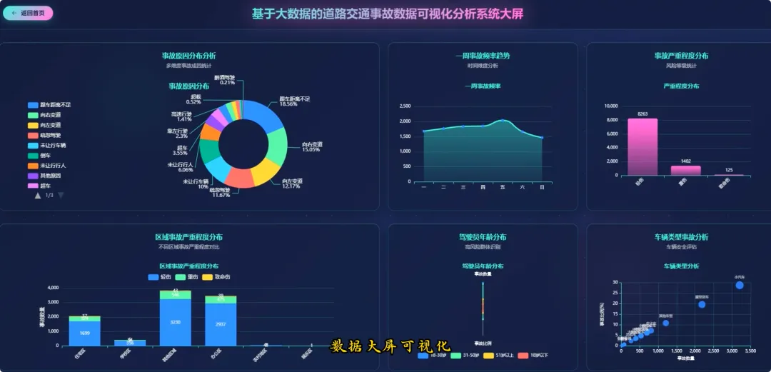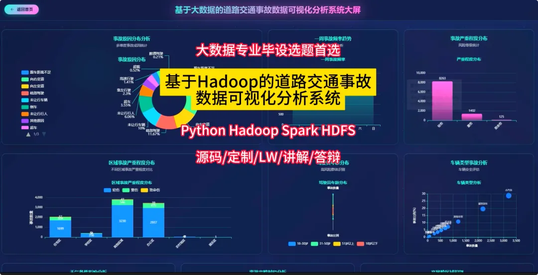 from pyspark.sql import SparkSessionspark = SparkSession.builder.appName("TrafficAccidentAnalysis").getOrCreate()df = spark.read.csv("hdfs://localhost:9000/accident_data.csv", header=True, inferSchema=True)df.createOrReplaceTempView("accidents")def analyze_weekly_accidents(): print("开始分析一周内事故发生频率...") result_df = spark.sql("SELECT Day_of_week, COUNT(*) as accident_count FROM accidents WHERE Day_of_week IS NOT NULL GROUP BY Day_of_week ORDER BY accident_count DESC") results = result_df.collect() print("分析完成,结果如下:") for row in results: print(f"星期{row['Day_of_week']}: {row['accident_count']}起事故") return resultsdef analyze_driver_age(): print("开始分析不同年龄段司机事故率...") result_df = spark.sql("SELECT Age_band_of_driver, COUNT(*) as accident_count FROM accidents WHERE Age_band_of_driver IS NOT NULL AND Age_band_of_driver != 'Unknown' GROUP BY Age_band_of_driver ORDER BY accident_count DESC") results = result_df.collect() print("分析完成,结果如下:") for row in results: print(f"年龄段 {row['Age_band_of_driver']}: {row['accident_count']}起事故") return resultsdef analyze_weather_severity(): print("开始分析天气条件对事故严重程度的影响...") result_df = spark.sql("SELECT Weather_conditions, Accident_severity, COUNT(*) as count FROM accidents WHERE Weather_conditions IS NOT NULL AND Accident_severity IS NOT NULL GROUP BY Weather_conditions, Accident_severity ORDER BY Weather_conditions, count DESC") results = result_df.collect() print("分析完成,结果如下:") for row in results: print(f"天气: {row['Weather_conditions']}, 严重程度: {row['Accident_severity']}, 事故数: {row['count']}") return results