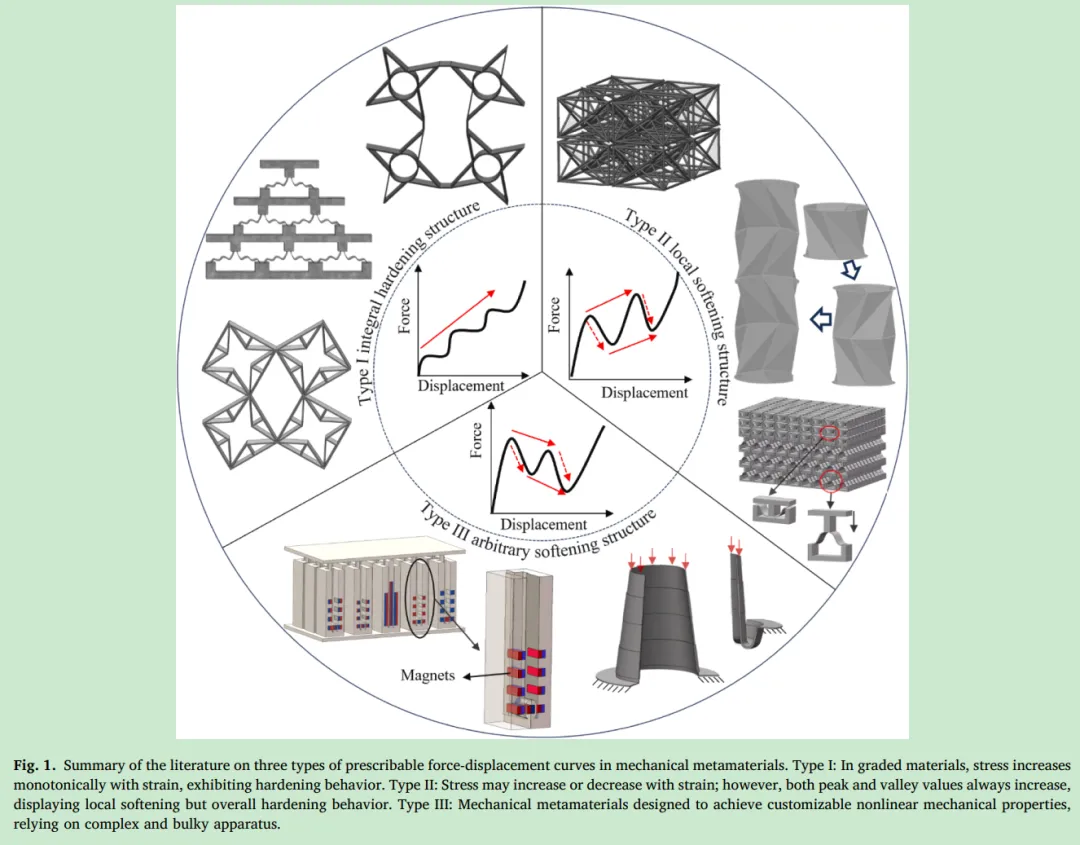 1. 机械超材料的需求:机械超材料通过几何结构设计,能够实现传统材料不具备的力学性能(如负泊松比、高能量吸收等),在航天、汽车、生物医学等领域有广泛应用。其中,可编程的非线性力-位移响应(如多阶段软化或硬化)对于能量吸收和振动隔离至关重要。