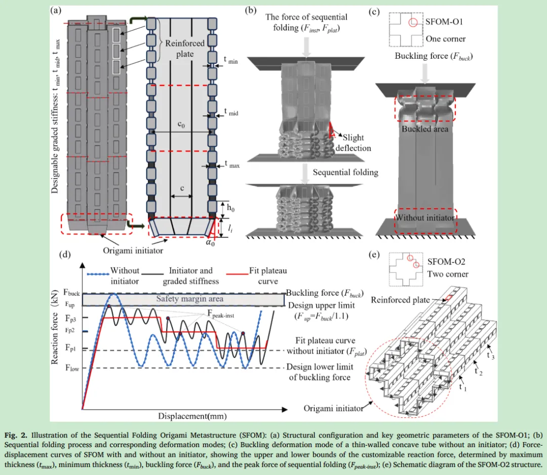 1. 概念设计:提出一种梯度刚度序列折叠折纸超结构。核心是在具有凹面截面的薄壁管(SFOM)上,引入折纸触发器来控制变形的起始与顺序,并沿轴向梯度化壁厚以对应不同的平台力。