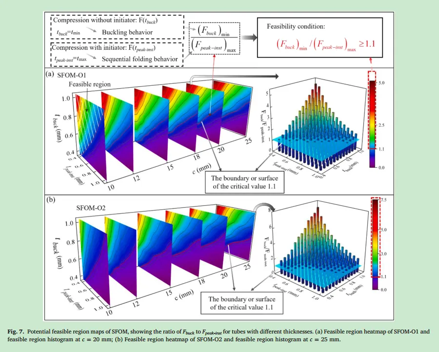 • 关键条件是:最薄处的屈曲力 F_buck_min 必须大于最厚处的瞬时折叠峰值力 F_peak-inst_max 的 1.1倍(安全边际)。