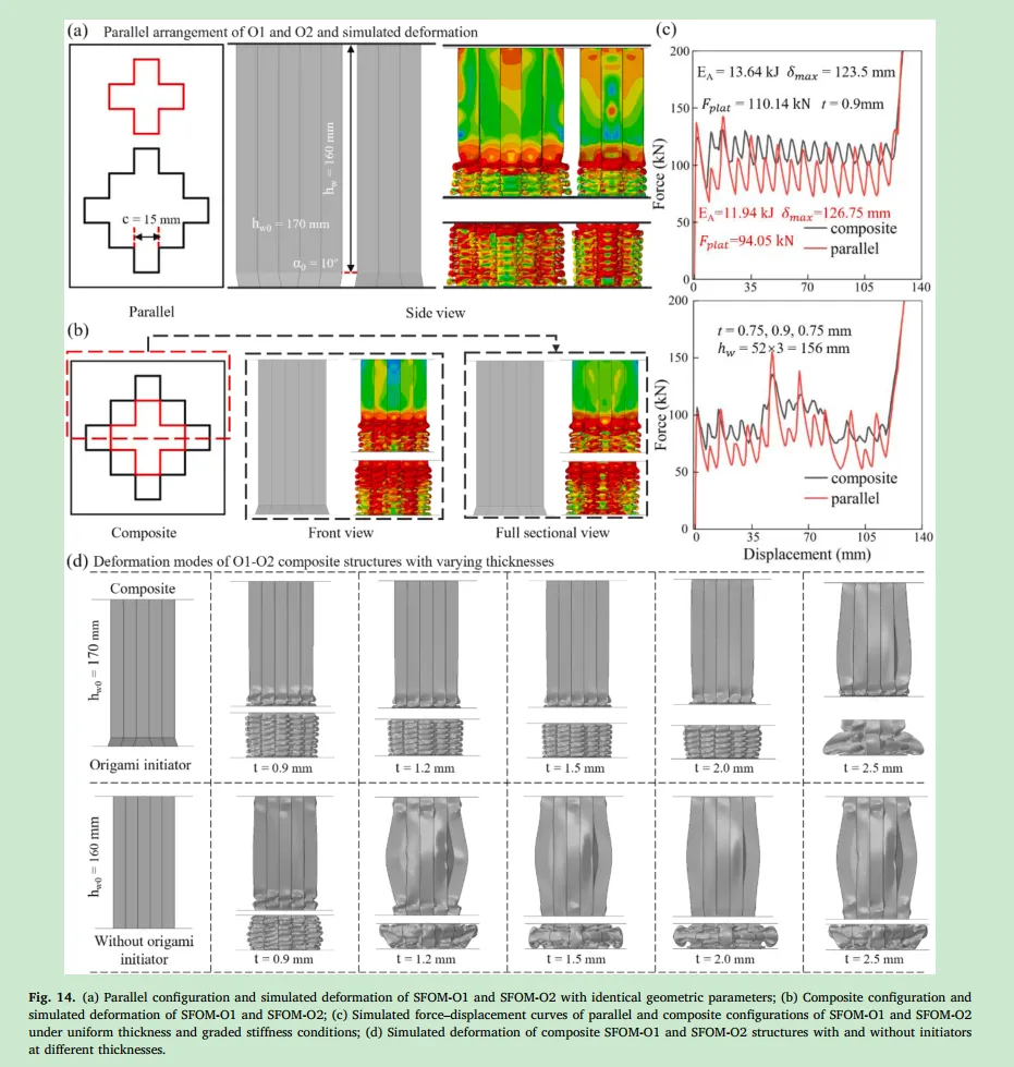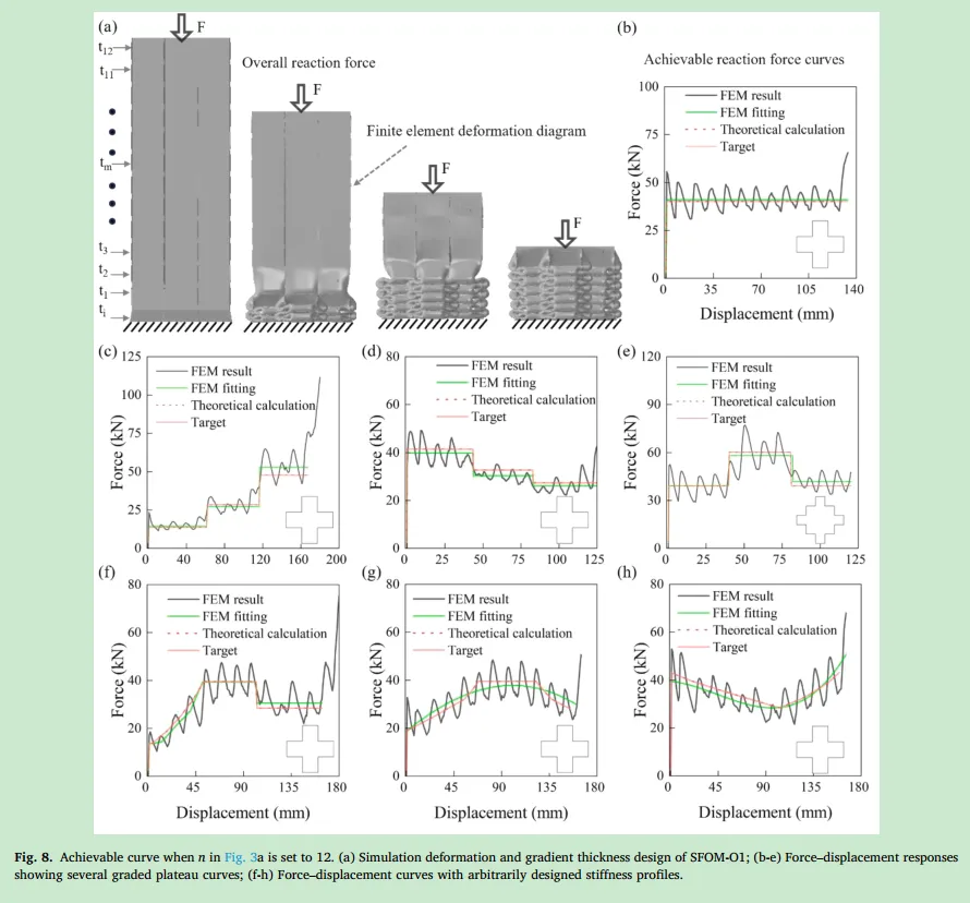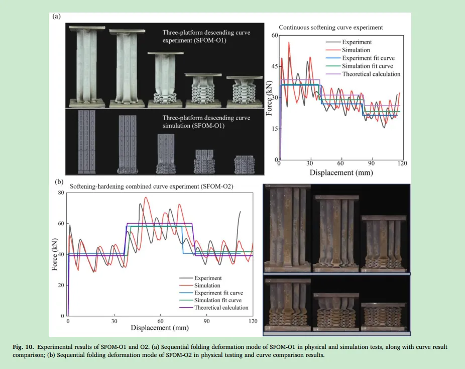1. 机制创新:提出了“序列折叠机制与刚度梯度解耦”的核心思想。通过折纸触发器确保变形按预定顺序进行,而与各单元自身的刚度(壁厚)分布无关,从而允许实现包含下降段(软化)在内的任意力-位移曲线。