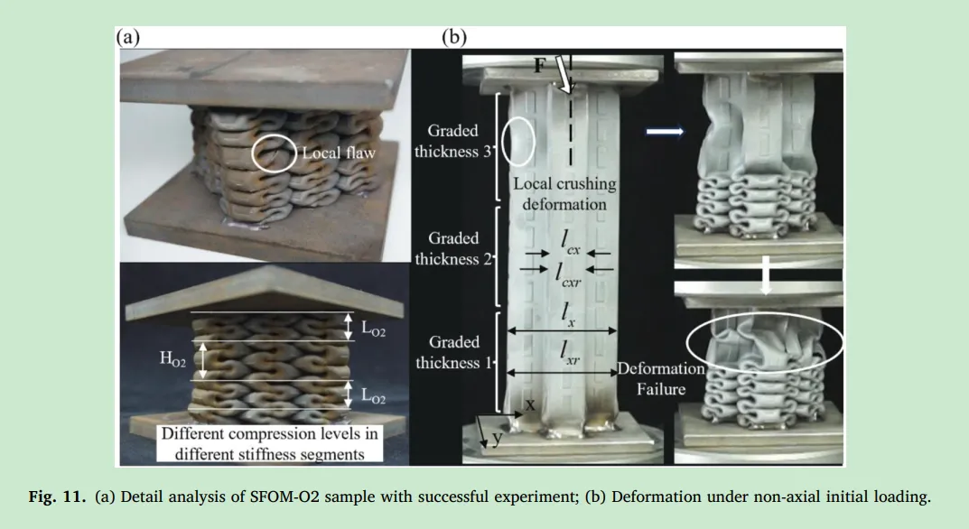 • 实验制造与测试:采用金属3D打印(316L不锈钢)制造SFOM原型件,并进行热处理。通过准静态压缩试验,对比实验、仿真与理论曲线的吻合度,验证设计的可行性。