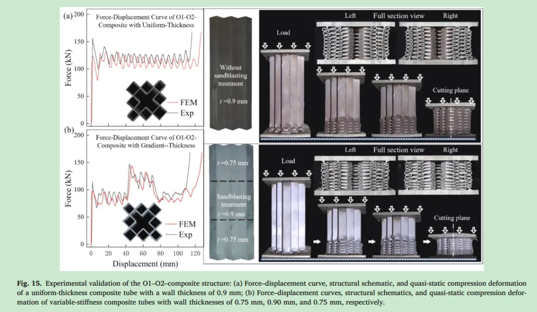 • 设计了SFOM-O1与O2的复合嵌套结构,在无需改变单元几何的前提下,显著降低了力-位移曲线的波动幅度,同时提高了比吸能和平均压溃力。