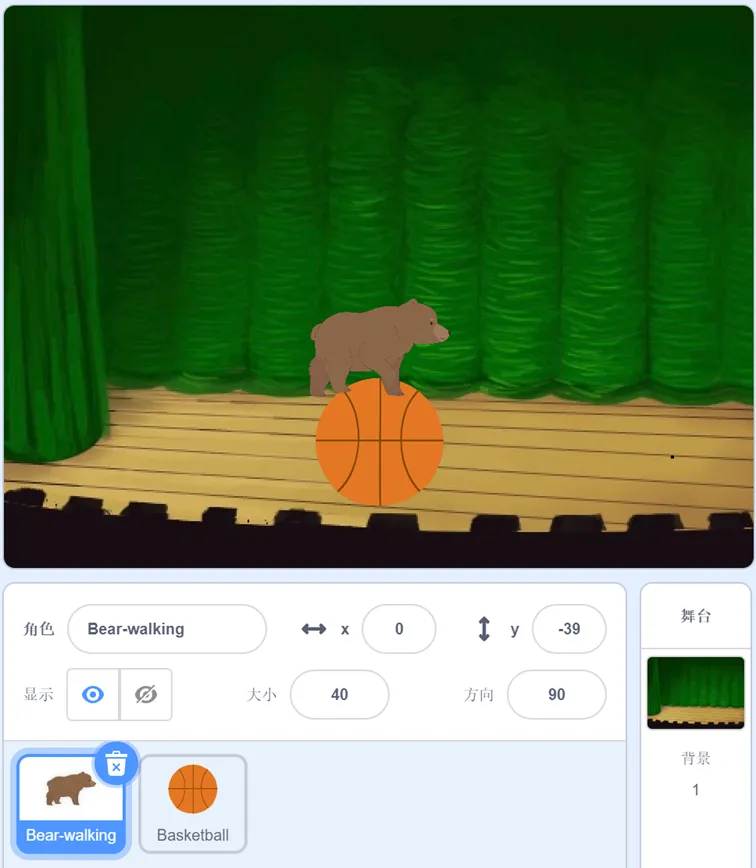(3)点击绿旗,角色Basketball的初始大小为180,初始方向为90°,移到Bear-walking所在位置并将Y坐标减少60,这样就呈现出熊踩球的效果。