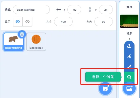 删除默认小猫角色;添加角色Bear-walking和Basketball。