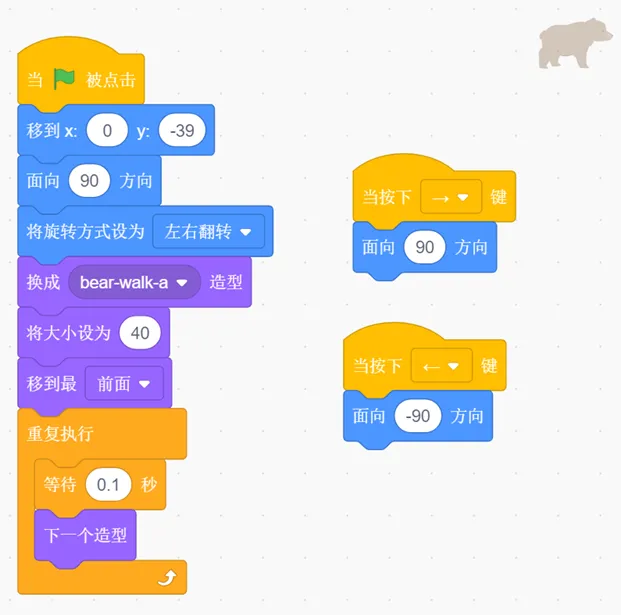 (5)当按下向左键时,Bear-walking面向左边,当按下向右键时,Bear-walking面向右边。