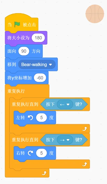 (6)Basketball不停向左转5°,直到按下向左键,Basketball不停右转5°,直到按下向右键,重复以上过程。这样即可呈现开始逆时针转,按下向左键顺时针转,按下向右键逆时针转的效果。