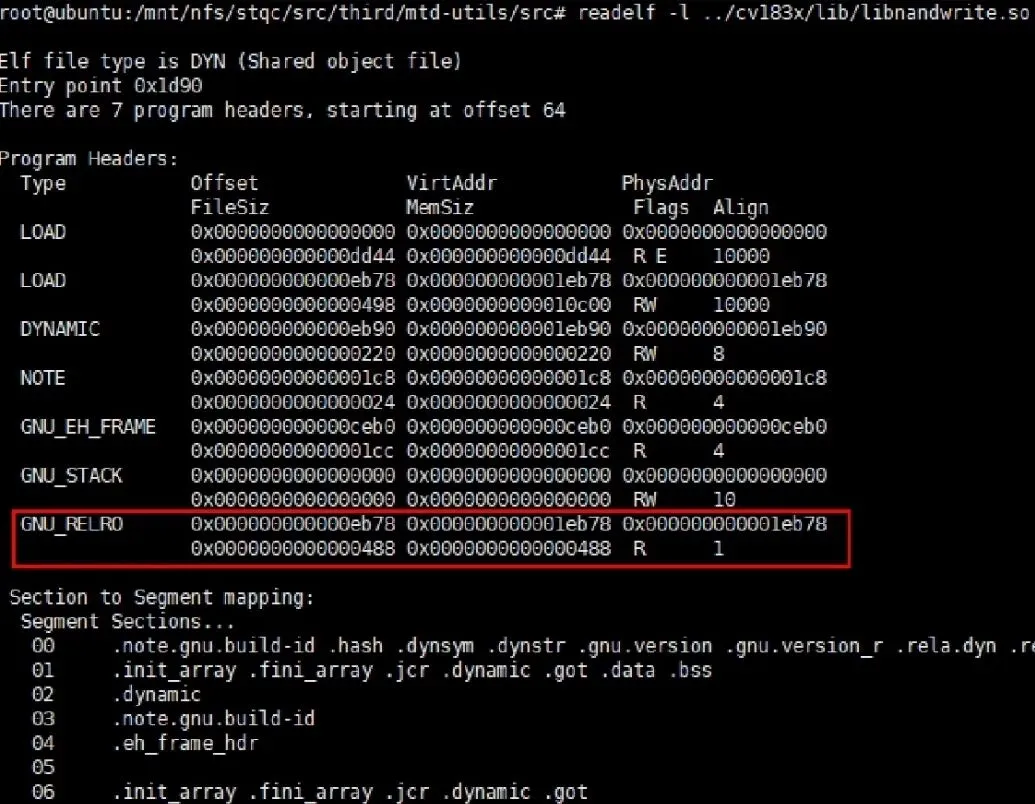 LDFLAGS += -shared -Wl,-z,noexecstack,-z,relro,-z,now针对NO RELRO这个问题,通过readelf -l xxx.so指令来查看增加了上文LDFLAGS中的编译选项后是否包含了GNU_RELRO,如下所示: