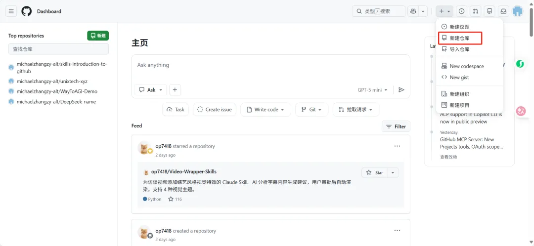 - 1.登录 GitHub,点击右上角的 + → New repository(新建仓库)
