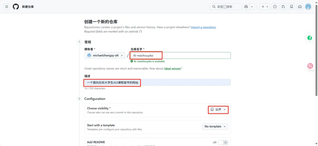 - Repository name(仓库名):比如 AI-meizhouyike(AI周课)