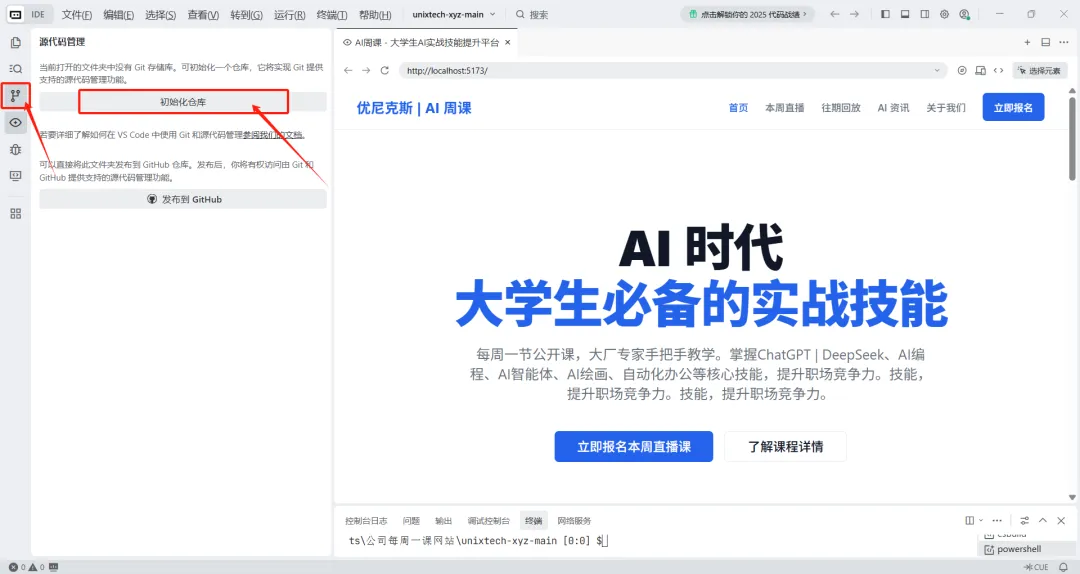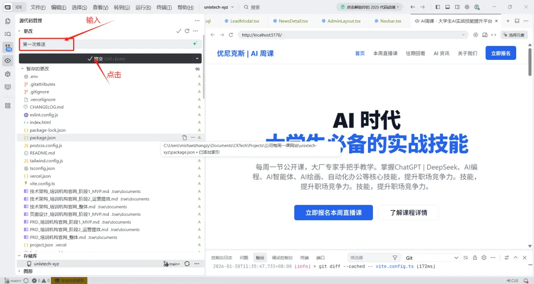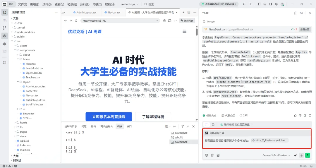 直接在IDE对话框告诉 AI:“帮我把当前项目推送到这个仓库地址:[你的地址]”。AI 会自动帮你完成初始化、提交和推送。