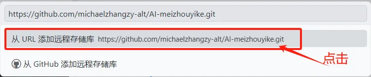 备注:查看AI-meizhouyike仓库是否添加成功,你可以点击“远程-删除远程存储库”,如果里面出现这个仓库名称就添加成功。没有的话,就再重复 步骤2。(有时网络问题会导致没有添加成功)