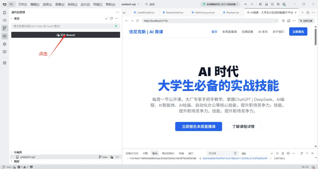 注意: 点完后,左边那一大排文件列表应该会消失,这说明打包成功了。同时,刚才的“提交”按钮的位置,它通常会变成一个写着“发布 Branch”的按钮。