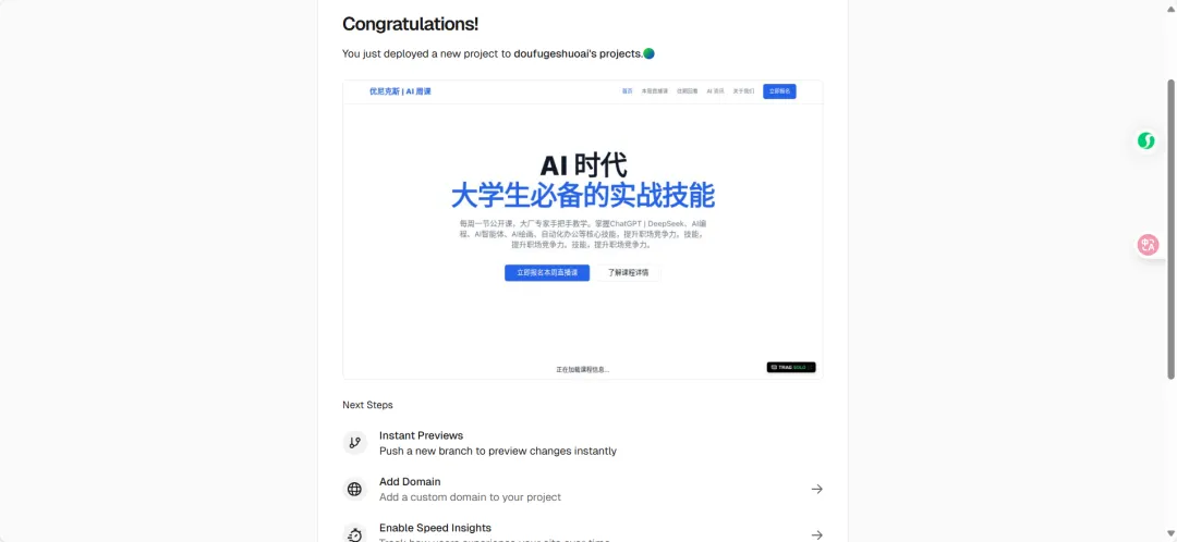 这样两个平台就能自动联动,你在 GitHub 更新代码,Vercel 会自动帮你更新网站!