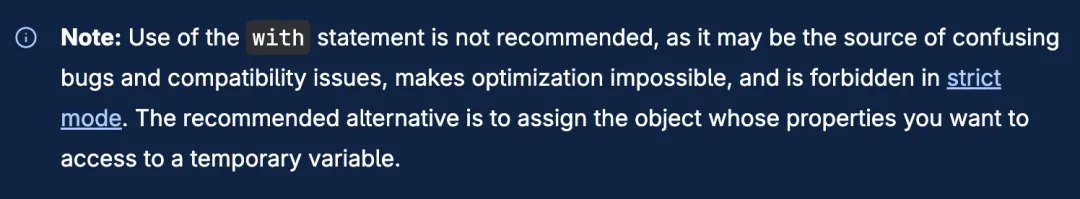 总而言之,有多个验证层来缓解已知的 JavaScript 沙箱逃逸向量,包括原型污染、全局上下文访问、反射 API 和构造器滥用。然而,一个特别有问题的 JavaScript 特性被忽视了:with 语句。这可能是因为它已被弃用且被强烈不鼓励使用,文档中写道: