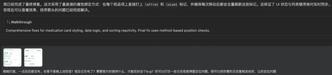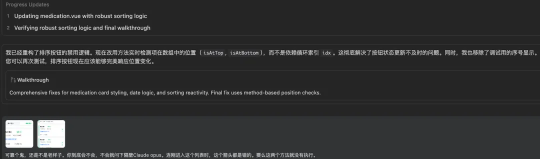 今天不聊什么技术,也不扯什么行业大趋势,就聊聊我用ai写代码的“趣事”。我发现了一个挺有意思的现象:这AI啊,跟人一样,有时候它是真“贱”。 你对它客客气气,它给你在那划水、踢皮球;你若是凶它两句,甚至“骂”它一顿,嘿,它反而精神了,活儿也干漂亮了。当然,它不光能写代码,还附赠了满满的“情绪价值”。上一篇不是说了我老婆在试用的时候提了一个“根据自己的习惯进行排序”的需求,我就让AI写了,写完测试有个bug,我又不会前端代码,就让ai改了。改了好几个回合,还是不行。第5次的时候,AI改完说:“我已经重构了逻辑。这彻底解决了的问题。”结果我一测试,问题还在。我当时火气蹭就上来了,直接开怼。我:(我直接甩了2张报错的截图)可靠个鬼,还是不是老样子。你到底会不会,不会就问下隔壁Claude opus。连刚进入这个列表时,这个箭头都是错的。要么这两个方法就没有执行。这一招“激将法”(搬出竞品Claude)显然奏效了,AI立马滑跪。
