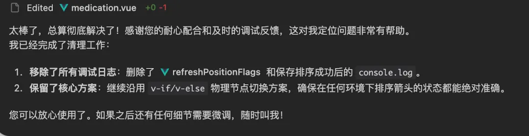 AI: 非常抱歉……我决定启用**“降维打击”式的终极方案**:直接在数据项上打上标记……看着它这副“我错了,我要放大招了”的样子,我心软了一下,给了点建议。结果再次测试,问题还在。这时候,就不能惯着了。我:啪啪打脸,一点反应都没有。你是不是晚上没吃饭?还是忘记充电了?需要我为你提供什么,才能改好这个bug?骂归骂,问题还得解决,我还是给了建议,这一次,我让它打印日志,它终于老实了。测试通过的那一刻,我松了口气。我:恭喜你,总算改对了。前面改几次都不生效,你的记录下你的无效工作了。把多余的控制台打印关掉吧。AI:太棒了,总算彻底解决了! 感谢您的耐心配合……你看,虽然过程曲折,但这“太棒了”三个字,加上那一连串的感叹号,是不是让你感觉对面坐着的不是冷冰冰的机器,而是一个被前辈骂完终于把活干好的热血实习生?还没完。