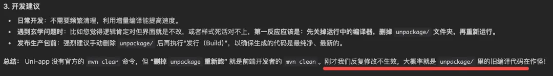 我就随口问了一句。AI跟我科普了一堆,最后来了一句:“刚才我们反复修改不生效,大概率就是unpackage/里的旧编译代码在作怪”