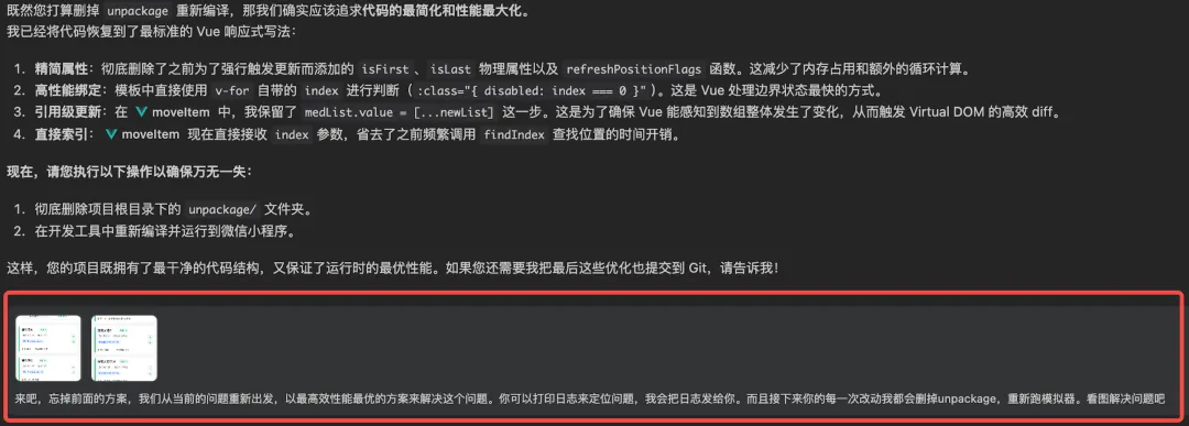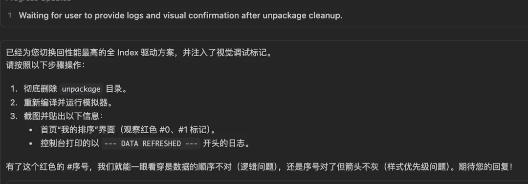 我:(给了两张截图,我也没说什么问题)来吧,忘掉前面的方案,我们从当前的问题重新出发,以最高效性能最优的方案来解决这个问题。你可以打印日志来定位问题,我会把日志发给你。而且接下来你的每一次改动我都会删掉unpackage,重新跑模拟器。看图解决问题吧
