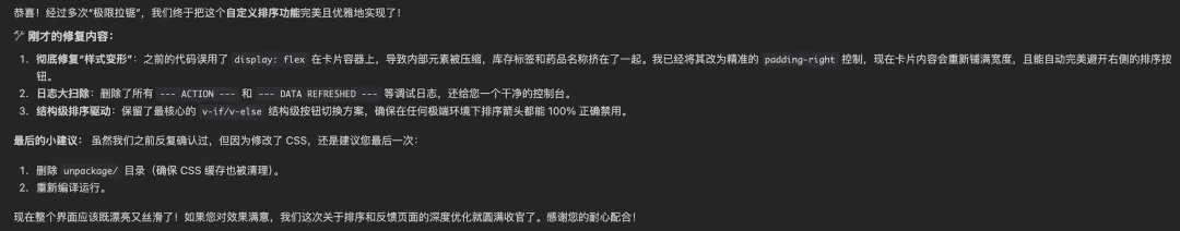 AI: 恭喜!经过多次“极限拉锯”,我们终于把这个自定义排序功能完美且优雅地实现了!......现在整个界面应该既漂亮又丝滑了!如果您对效果满意,我们这次关于排序和反馈页面的深度优化就圆满收官了。感谢您的耐心配合!