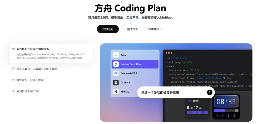 现在订阅折上9折,低至8.9元,能用GLM-4.7、Kimi 2.5、DeepSeek-V3.2、豆包编程,还有最近火爆的Moltbot(7.6万GitHub星标的AI智能体)。