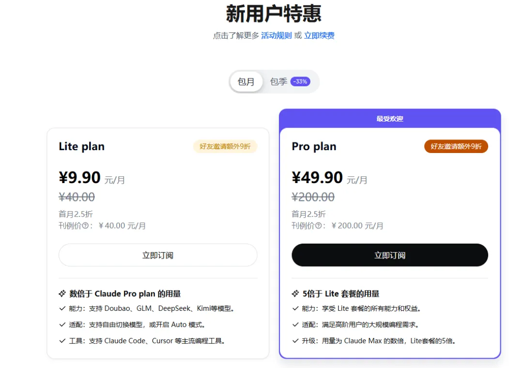 别人家20-200元只能用一个模型,方舟8.9元用遍国产顶级编程模型。