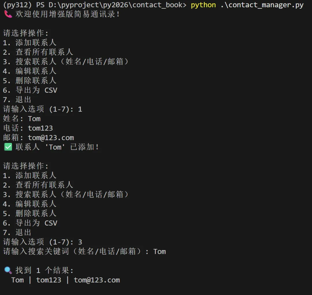 # contact_manager.pyimport jsonimport csvimport osCONTACTS_FILE = "contacts.json"CSV_EXPORT_FILE = "contacts_export.csv"def load_contacts(): """从 JSON 文件加载联系人""" if not os.path.exists(CONTACTS_FILE): return [] try: with open(CONTACTS_FILE, "r", encoding="utf-8") as f: return json.load(f) except (json.JSONDecodeError, IOError) as e: print(f"⚠️ 警告:无法读取联系人文件,使用空列表。错误: {e}") return []def save_contacts(contacts): """将联系人保存到 JSON 文件""" try: with open(CONTACTS_FILE, "w", encoding="utf-8") as f: json.dump(contacts, f, ensure_ascii=False, indent=2) except IOError as e: print(f"❌ 保存失败: {e}")def find_contact_by_name(contacts, name): """按姓名精确查找(用于编辑/删除)""" for i, contact in enumerate(contacts): if contact["name"] == name: return i, contact return None, Nonedef search_contact(contacts): """支持按姓名、电话、邮箱模糊搜索""" keyword = input("请输入搜索关键词(姓名/电话/邮箱): ").strip() if not keyword: print("❌ 请输入关键词!") return results = [] keyword_lower = keyword.lower() for contact in contacts: if (keyword_lower in contact["name"].lower() or keyword_lower in contact["phone"].lower() or keyword_lower in contact["email"].lower()): results.append(contact) if results: print(f"\n🔍 找到 {len(results)} 个结果:") for c in results: print(f" {c['name']} | {c['phone']} | {c['email']}") else: print("❌ 未找到匹配的联系人") print()def add_contact(contacts): """添加新联系人""" name = input("姓名: ").strip() if not name: print("❌ 姓名不能为空!") return if any(c["name"] == name for c in contacts): print(f"❌ 联系人 '{name}' 已存在!") return phone = input("电话: ").strip() email = input("邮箱: ").strip() contacts.append({ "name": name, "phone": phone, "email": email }) save_contacts(contacts) print(f"✅ 联系人 '{name}' 已添加!")def list_contacts(contacts): """列出所有联系人""" if not contacts: print("📭 通讯录为空") return print("\n📋 所有联系人:") for i, contact in enumerate(contacts, 1): print(f"{i}. {contact['name']} | {contact['phone']} | {contact['email']}") print()def edit_contact(contacts): """编辑现有联系人""" name = input("请输入要编辑的联系人姓名: ").strip() if not name: print("❌ 请输入姓名!") return index, contact = find_contact_by_name(contacts, name) if contact is None: print("❌ 未找到该联系人") return print(f"\n当前信息: {contact['name']} | {contact['phone']} | {contact['email']}") print("留空表示不修改") new_name = input(f"新姓名 [{contact['name']}]: ").strip() new_phone = input(f"新电话 [{contact['phone']}]: ").strip() new_email = input(f"新邮箱 [{contact['email']}]: ").strip() # 更新字段(非空才覆盖) if new_name: # 检查新姓名是否冲突(排除自己) if new_name != contact["name"] and any(c["name"] == new_name for c in contacts): print(f"❌ 姓名 '{new_name}' 已被其他联系人使用!") return contact["name"] = new_name if new_phone: contact["phone"] = new_phone if new_email: contact["email"] = new_email save_contacts(contacts) print(f"✅ 联系人已更新为: {contact['name']} | {contact['phone']} | {contact['email']}")def delete_contact(contacts): """删除联系人""" name = input("请输入要删除的姓名: ").strip() if not name: print("❌ 请输入姓名!") return index, contact = find_contact_by_name(contacts, name) if contact is None: print("❌ 未找到该联系人") return del contacts[index] save_contacts(contacts) print(f"✅ 联系人 '{name}' 已删除!")def export_to_csv(contacts): """导出联系人到 CSV 文件""" if not contacts: print("📭 通讯录为空,无法导出") return try: with open(CSV_EXPORT_FILE, "w", newline="", encoding="utf-8-sig") as f: writer = csv.DictWriter(f, fieldnames=["name", "phone", "email"]) writer.writeheader() writer.writerows(contacts) print(f"✅ 已导出 {len(contacts)} 条联系人到 {CSV_EXPORT_FILE}") except IOError as e: print(f"❌ 导出失败: {e}")def main(): """主程序循环""" contacts = load_contacts() print("📞 欢迎使用增强版简易通讯录!") while True: print("\n请选择操作:") print("1. 添加联系人") print("2. 查看所有联系人") print("3. 搜索联系人(姓名/电话/邮箱)") print("4. 编辑联系人") print("5. 删除联系人") print("6. 导出为 CSV") print("7. 退出") choice = input("请输入选项 (1-7): ").strip() if choice == "1": add_contact(contacts) elif choice == "2": list_contacts(contacts) elif choice == "3": search_contact(contacts) elif choice == "4": edit_contact(contacts) elif choice == "5": delete_contact(contacts) elif choice == "6": export_to_csv(contacts) elif choice == "7": print("👋 再见!") break else: print("❌ 无效选项,请输入 1-7")if __name__ == "__main__": main()